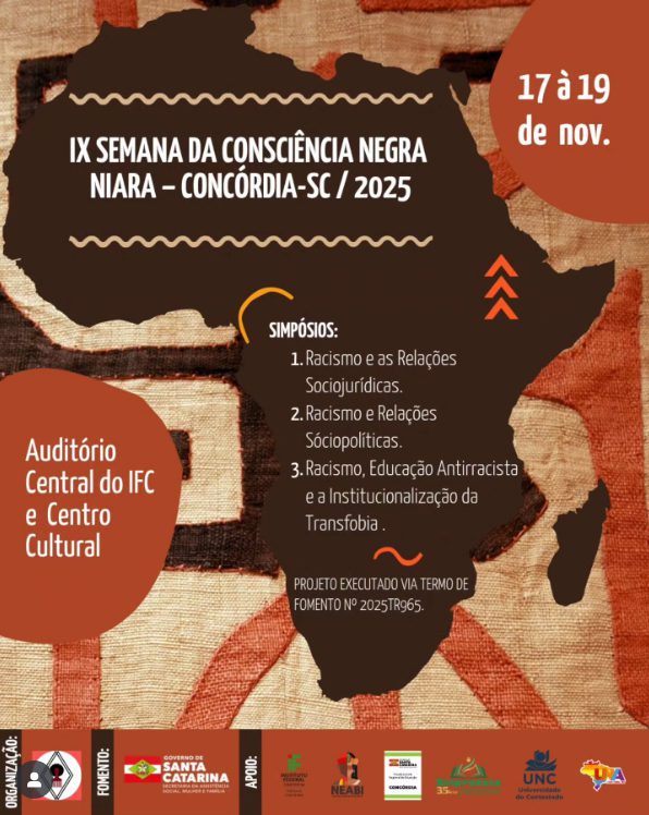 A programação é composta pelo Ciclo de Debates “Racismo e Outras Xenofobias em Foco” e reúne professores, pesquisadores, lideranças comunitárias e agentes públicos em três dias de reflexões, diálogos e ações por uma sociedade antirracista, justa e plural. O evento acontecerá no Centro Cultural Concórdia e Instituto Federal Catarinense – Campus Concórdia.