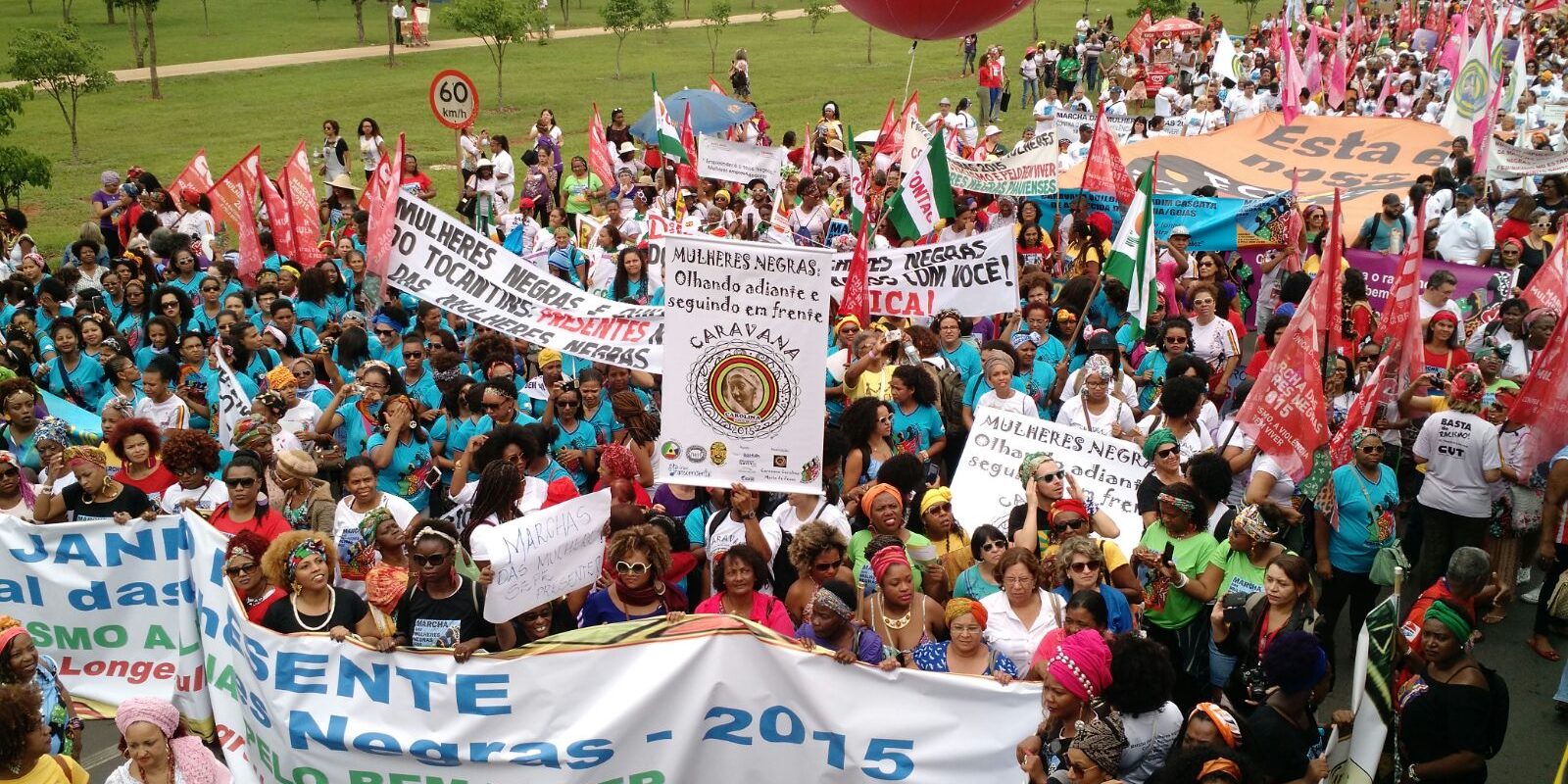 Com roupas e turbantes coloridos, com música e dança, cartazes e discursos, cerca de 25 mil mulheres negras percorreram as ruas anunciando que marchariam “até que todas as mulheres sejam livres”.