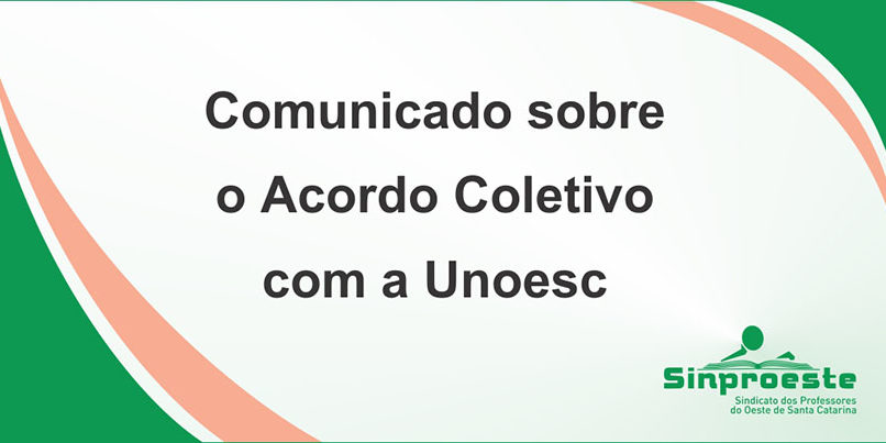 O Sinproeste comunica que a Unoesc decidiu, de forma unilateral, não discutir e assinar o novo Acordo Coletivo de Trabalho com o Sinproeste para este ano. O processo negocial, prática comum entre Sinproeste e Unoesc, que ocorria de forma serena e responsável, logo após o fechamento das negociações da Convenção Coletiva de Trabalho com o Sinepe (sindicato patronal), foi suspenso pela Unoesc.
