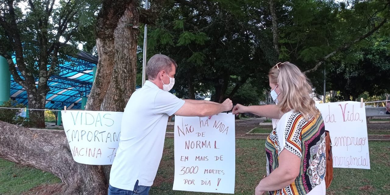 Na quarta, dia 24 de março, o coletivo sindical de São Miguel do Oeste fez uma manifestação silenciosa em protesto pelo descaso com que se está enfrentando a pandemia causada pelo Covid 19 e a inversão de valores provocados pelo capital. O Sinproeste integra o coletivo sindical na cidade e foi representado pelo delegado regional, professor Izanir Zandona.