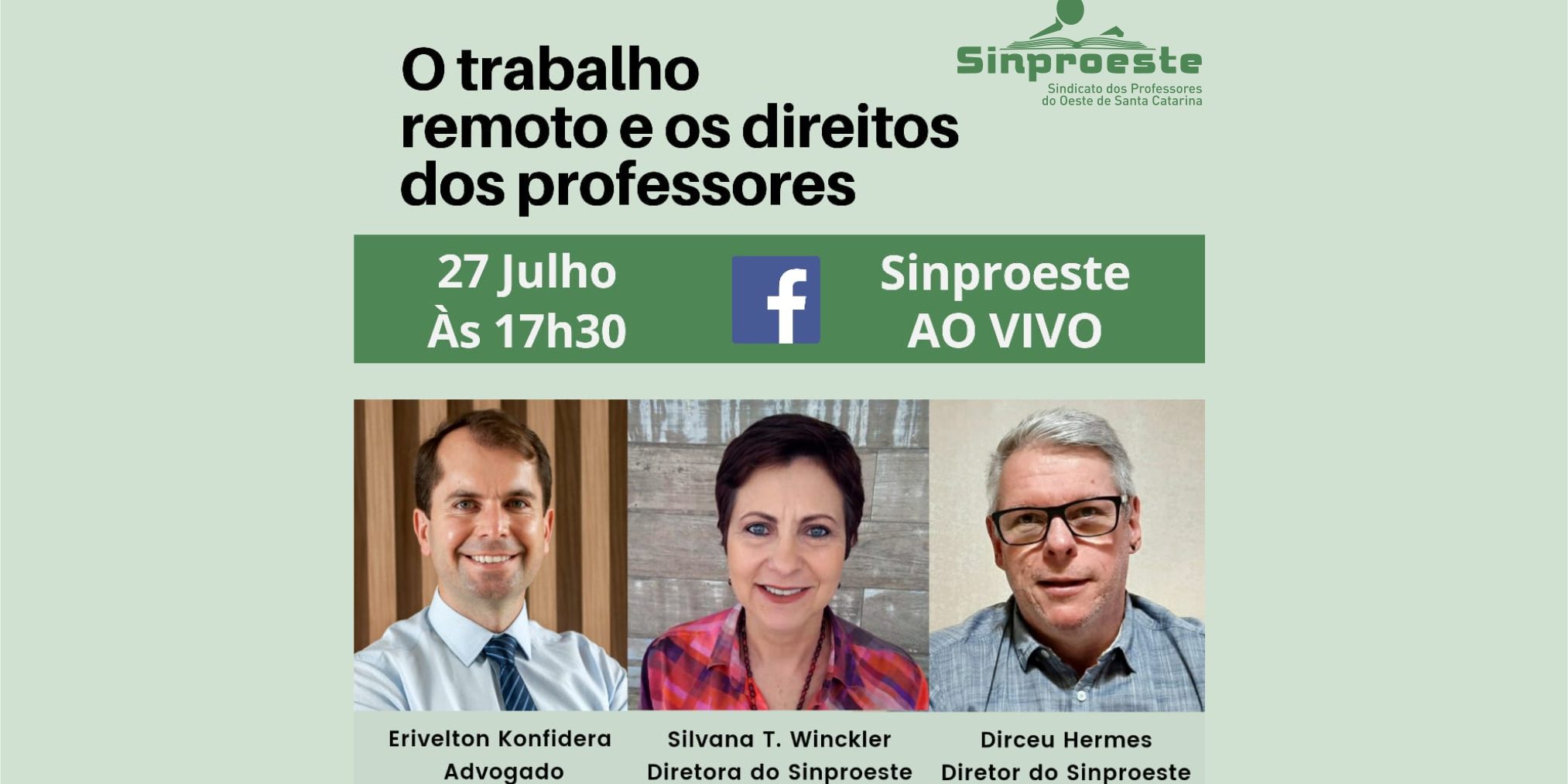 Dessa vez o tema será os direitos dos professores durante o trabalho remoto. O professor Dirceu conduzirá a conversa com a participação do assessor jurídico do sindicato, o advogado Erivelton Konfidera, e diretora do Sinproeste, professora Silvana Terezinha Winckler.