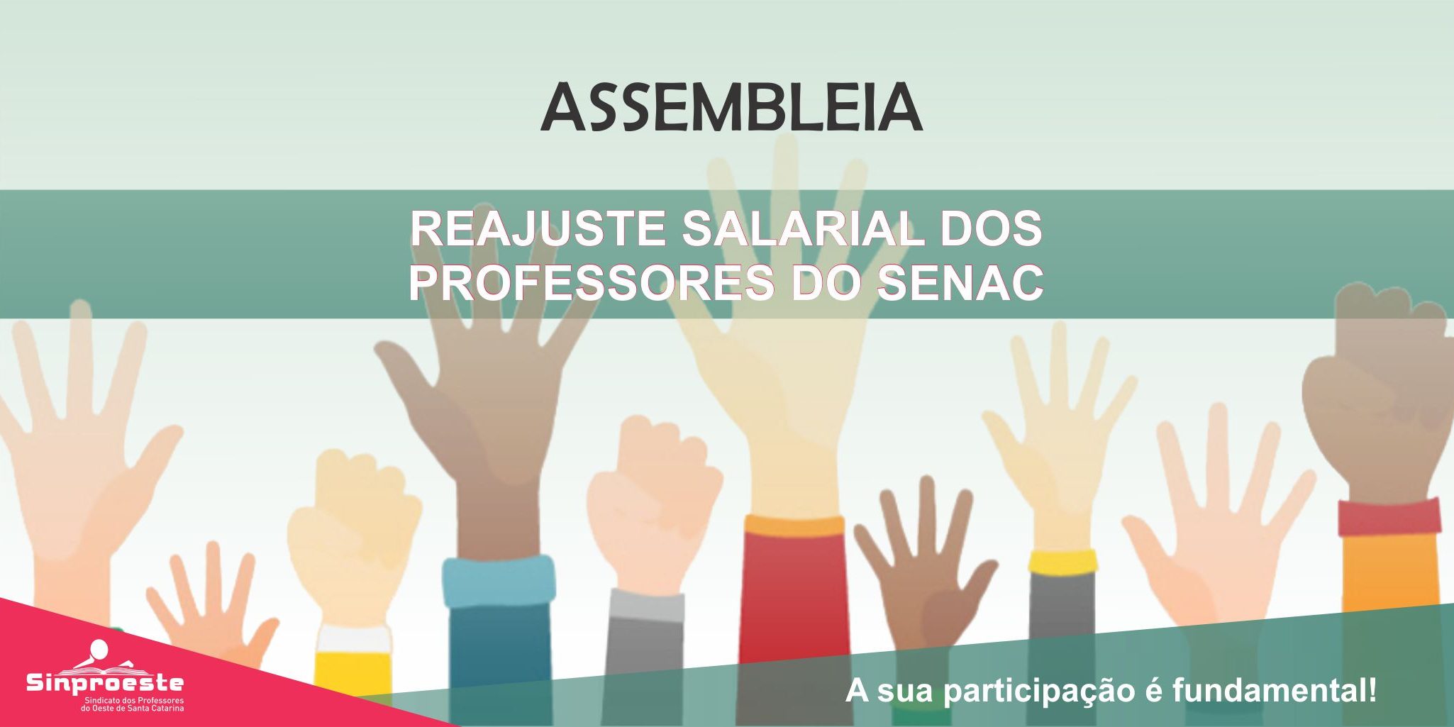 A direção do Sinproeste convoca os professores do Senac, sócios e não sócios, para assembleia com o objetivo de discutir e deliberar sobre as reivindicações e propostas para a campanha salarial desse ano. As assembleia serão regionais, ocorrendo nas delegacias de Concórdia, Xanxerê, São Miguel do Oeste e na sede, em Chapecó. Confira abaixo o cronograma e participe!