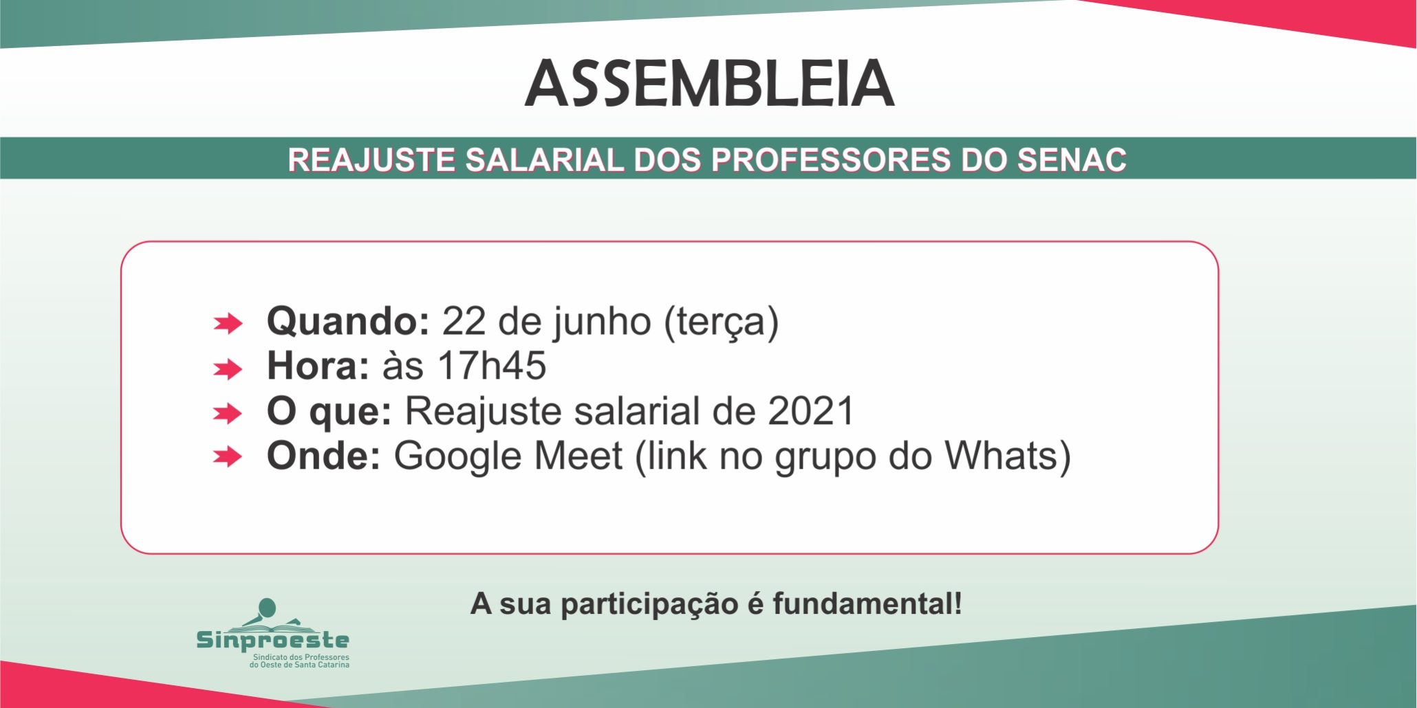 Os professores do Senac reúnem-se em assembleia hoje para discutir e deliberar sobre a pauta de reivindicações para a campanha salarial desse ano. A reunião acontecerá online, pelo Google Meet, às 17h45. O link de acesso está sendo enviado ao e-mail dos docentes e grupos de WhatsApp dos professores com o sindicato.