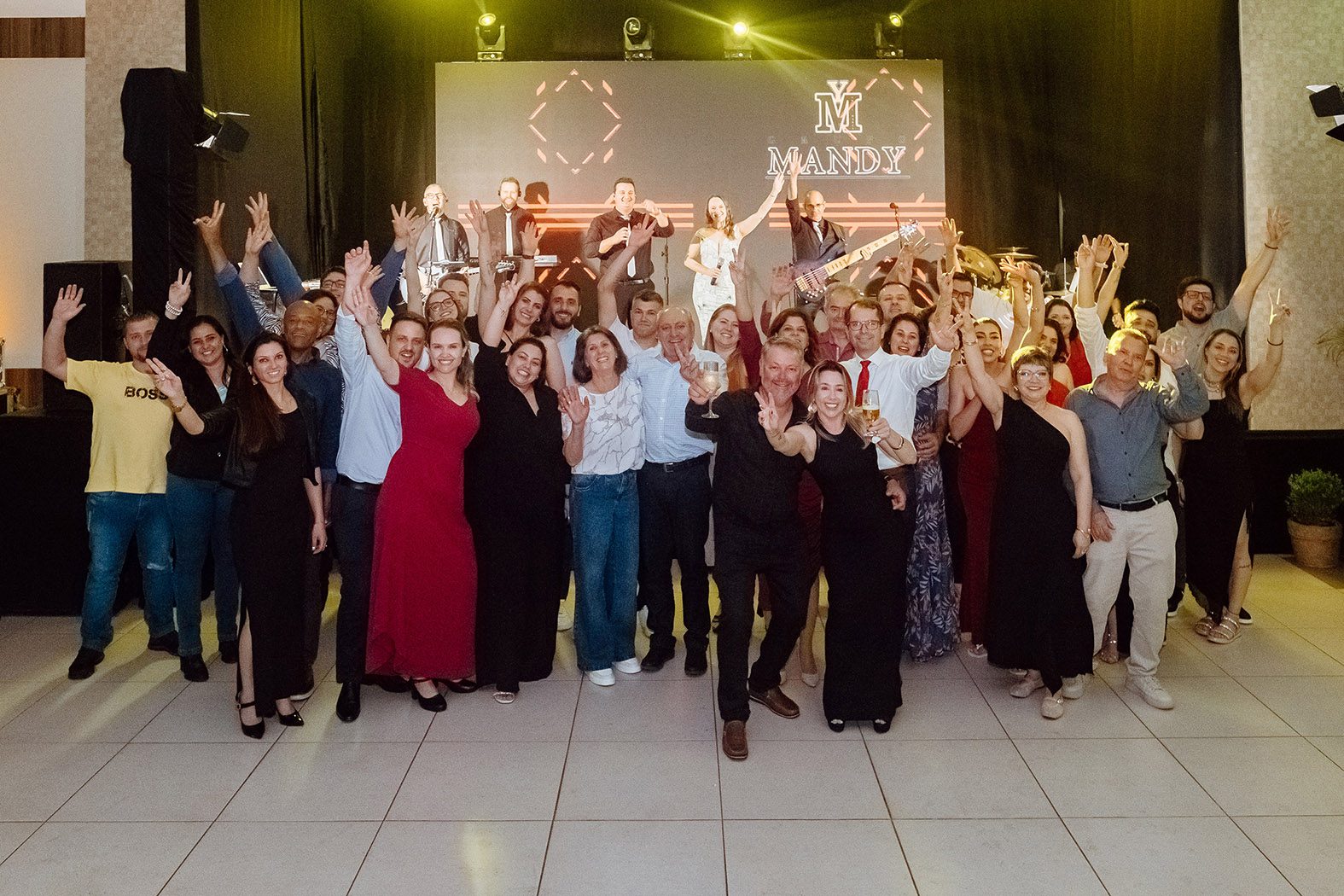 Um momento especial da festa foi o brinde aos 35 anos do sindicato, com a participação de todos os professores e convidados presentes. Após o jantar, a música ao vivo com Grupo Mandy animou as horas finais da festa, com muita dança e alegria.