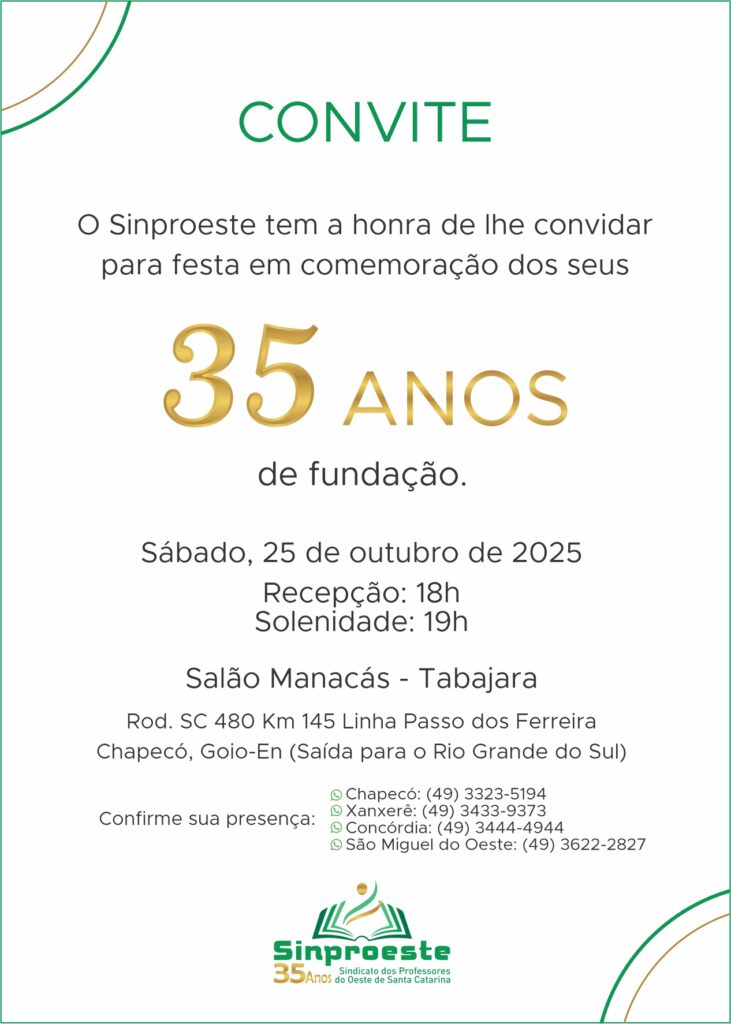 O Sinproeste – Sindicato dos Professores do Oeste de Santa Catarina, foi fundado em 22 de setembro 1990. Naquele tempo, os professores da rede privada de ensino do Oeste de Santa Catarina enfrentavam uma realidade dura: salários atrasados, falta de garantias, e nenhuma representação real. Foi pela urgência de ver seus salários pagos – e por dignidade – que um grupo corajoso de educadores iniciou o movimento de criação do sindicato.
