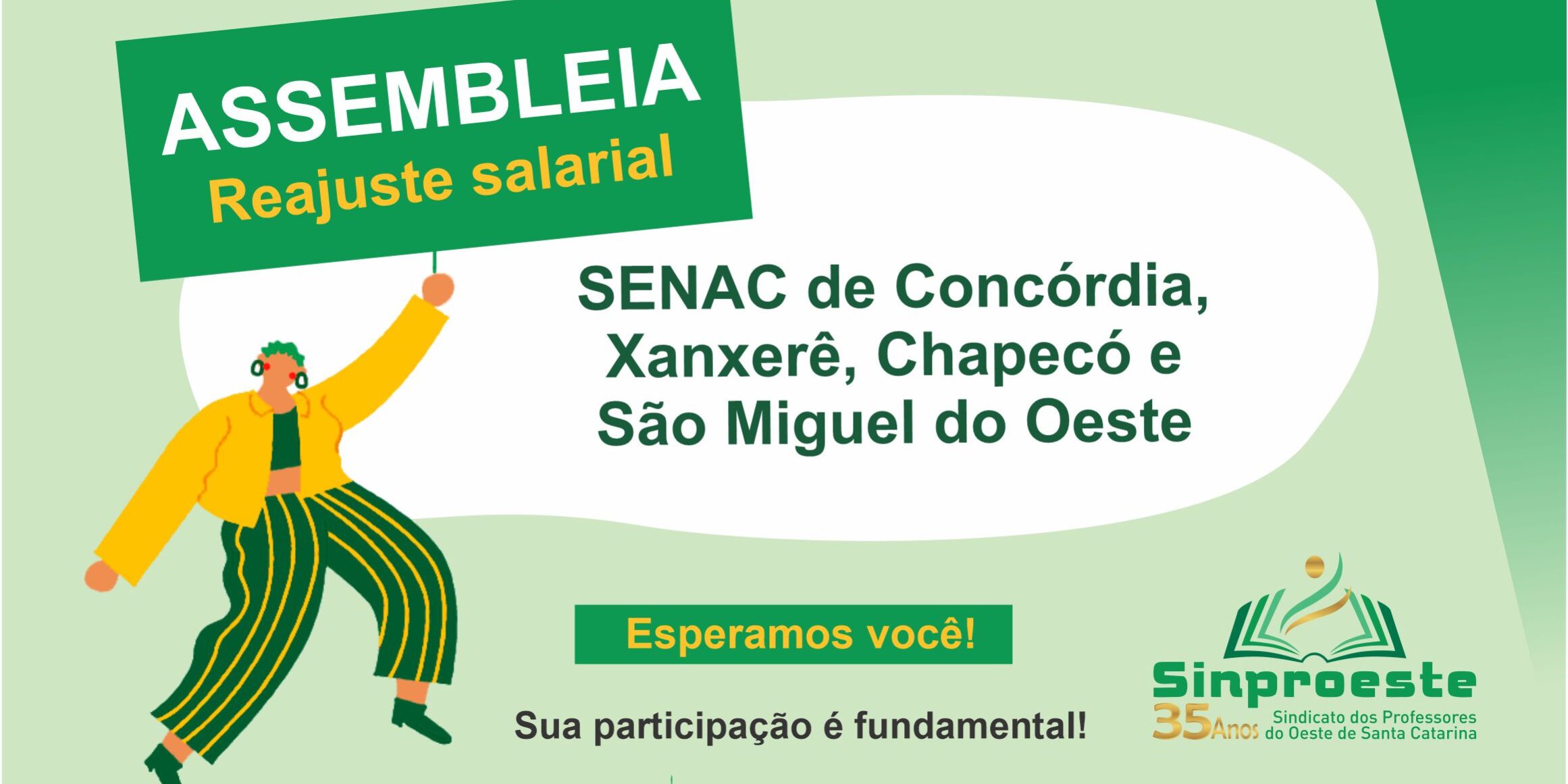 Nesta semana iniciam as assembleias com os professores do Senac, com o objetivo de discutir e deliberar sobre a pauta de reivindicações para a negociação salarial deste ano. Para isso, o sindicato convoca todos os professores do Senac, sócios e não sócios, para participarem nas assembleias que acontecerão em Concórdia, Xanxerê, Chapecó e São Miguel do Oeste conforme o cronograma que segue.