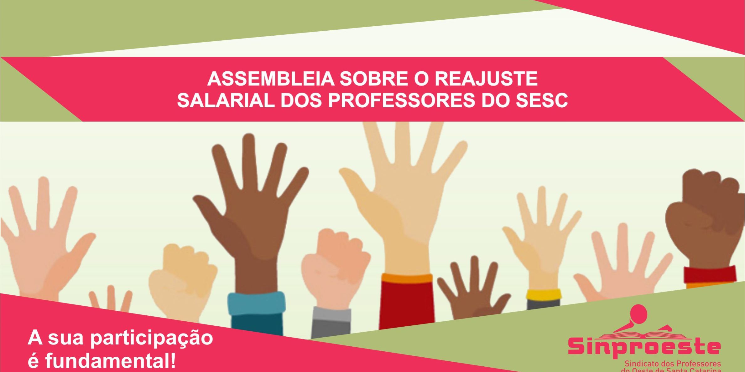 A diretoria do Sinproeste convoca todos os professores do Sesc para assembleia com o objetivo de discutir e deliberar sobre a pauta de reivindicações da campanha salarial deste ano. As reuniões acontecerão nas cidades de Concórdia, Xanxerê, Chapecó e São Miguel do Oeste. Veja o cronograma: