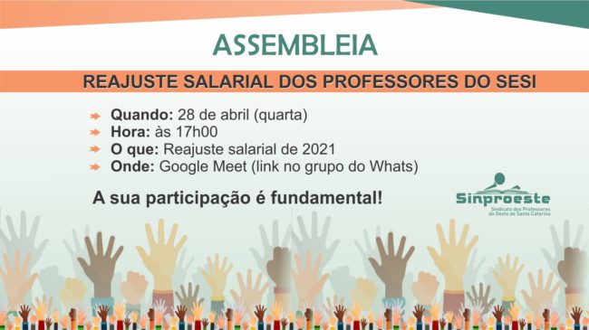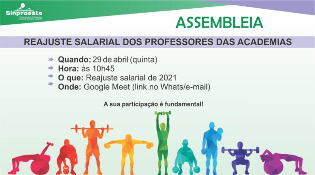 A diretoria do Sinproeste convoca todos os professores de educação física, sócios e não sócios, das academias, a se reunirem em Assembleia Geral online no dia 29 de abril de 2021 às 10h45 em primeira convocação e às 11h em segunda e última convocação, via Google Meet para discutir e deliberar sobre o reajuste salarial.…