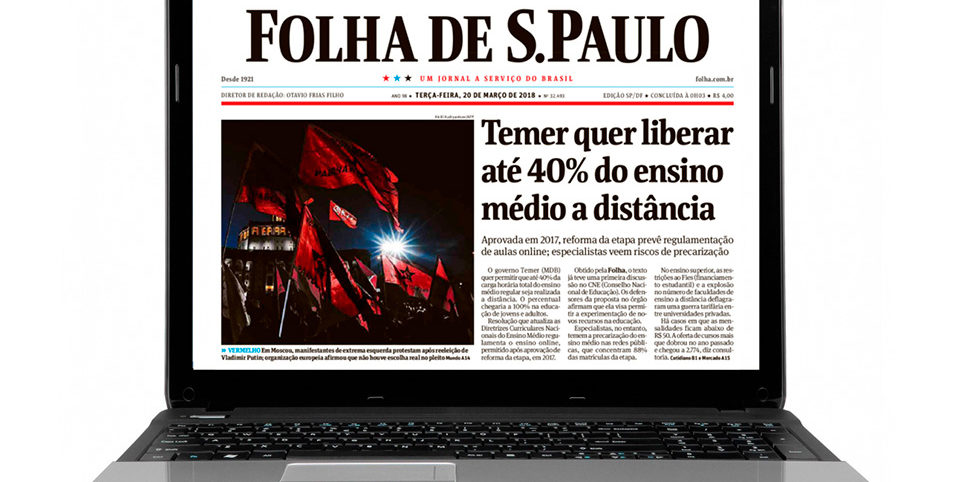 A Folha de São publicou ontem (20) uma reportagem relatando que o governo Michel Temer (MDB) quer liberar até 40% da carga horária total do ensino médio para ser realizada a distância. Já para a educação de jovens e adultos a proposta é permitir que 100% do curso seja fora da escola.